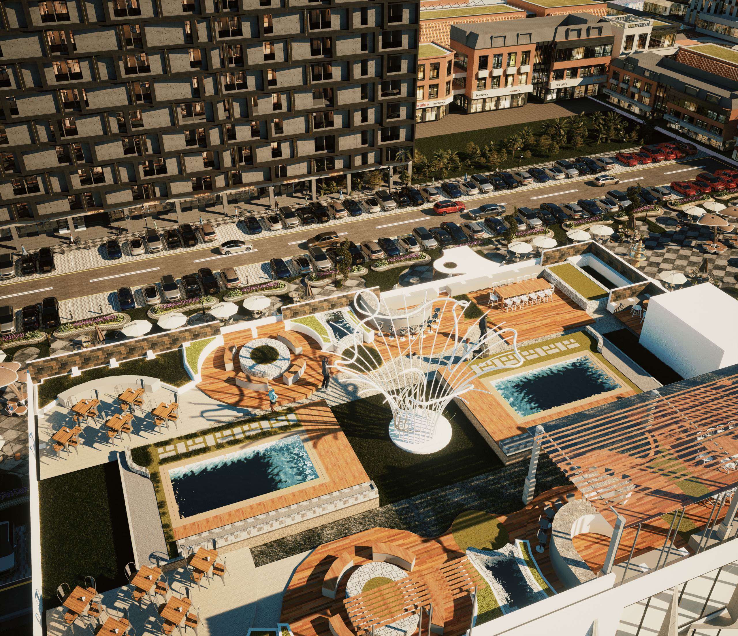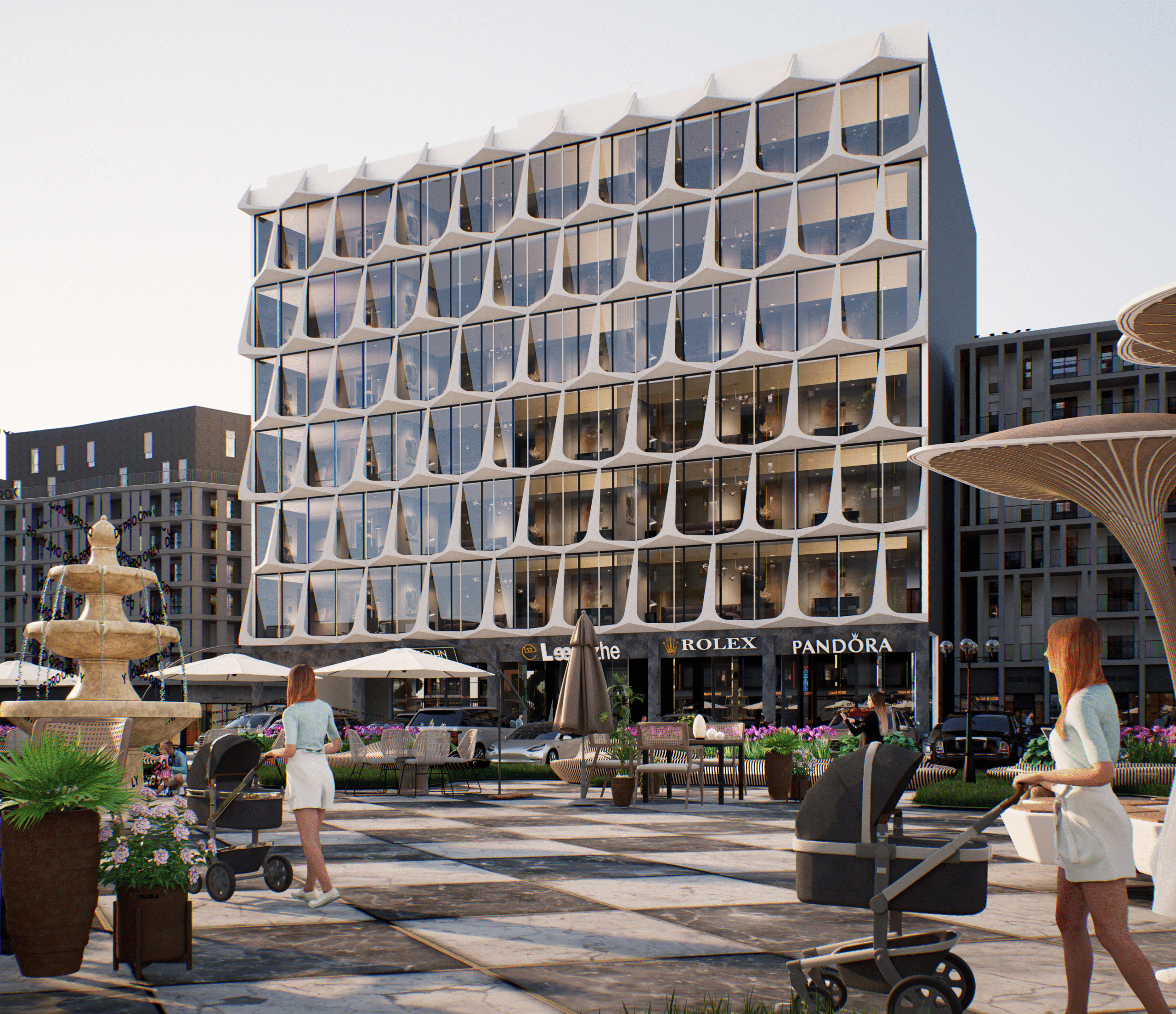Inspired by Dubai Downtown and DHA Raya Concept. Luxury apartments with private terraces & commercial brand outlets facing Fountain, Eiffel Tower and Park, with guaranteed high return on investments.